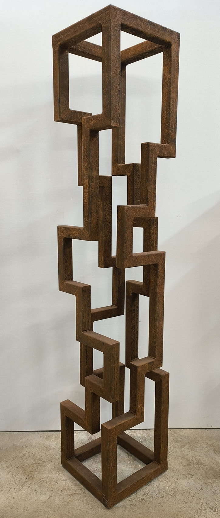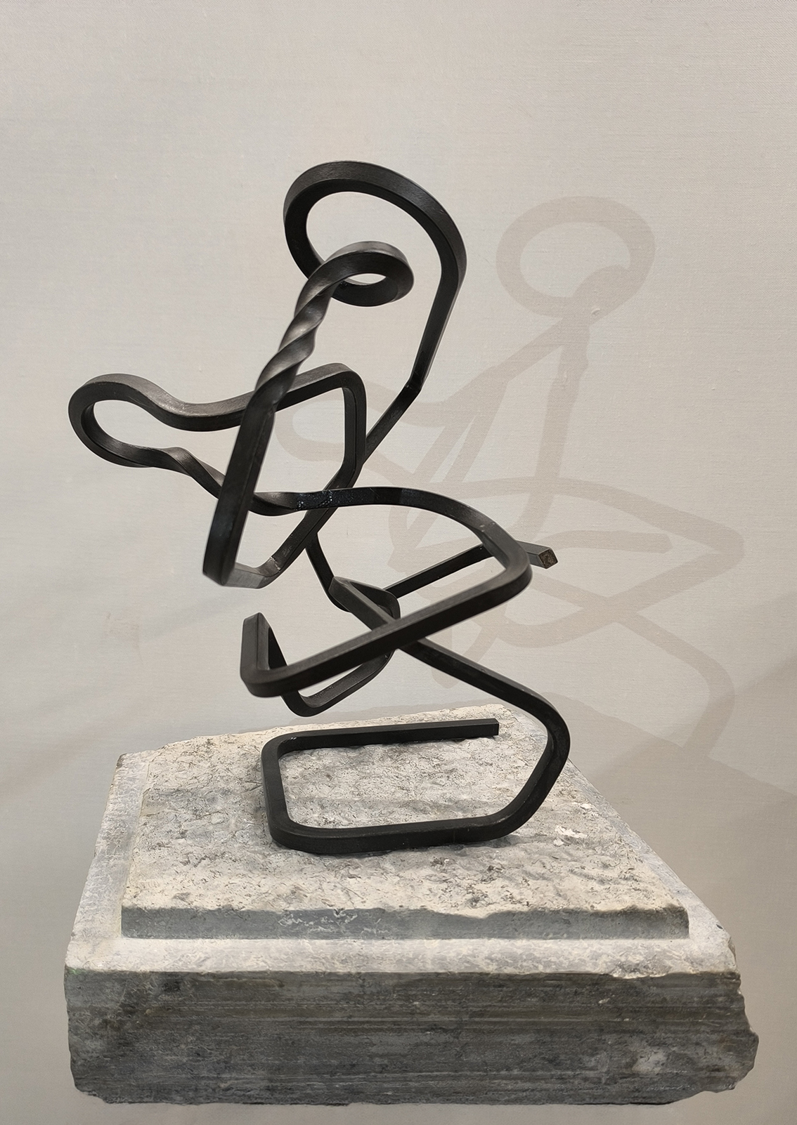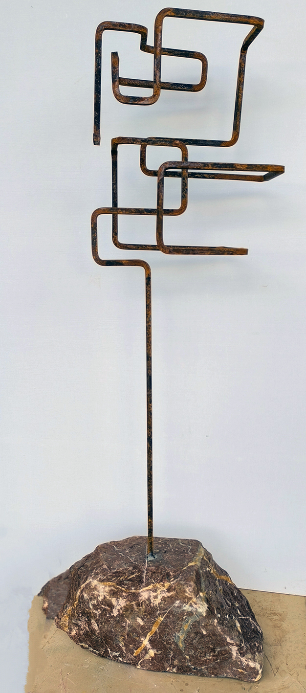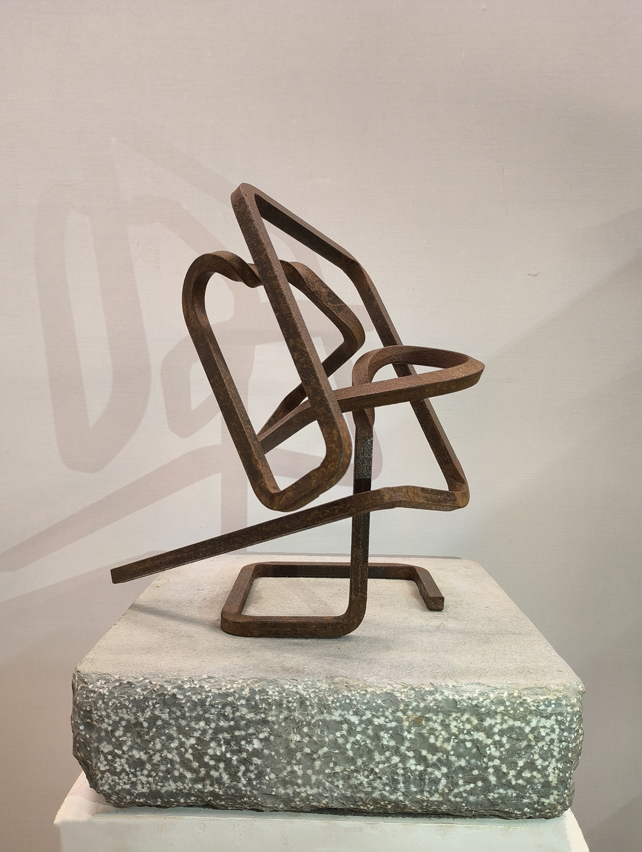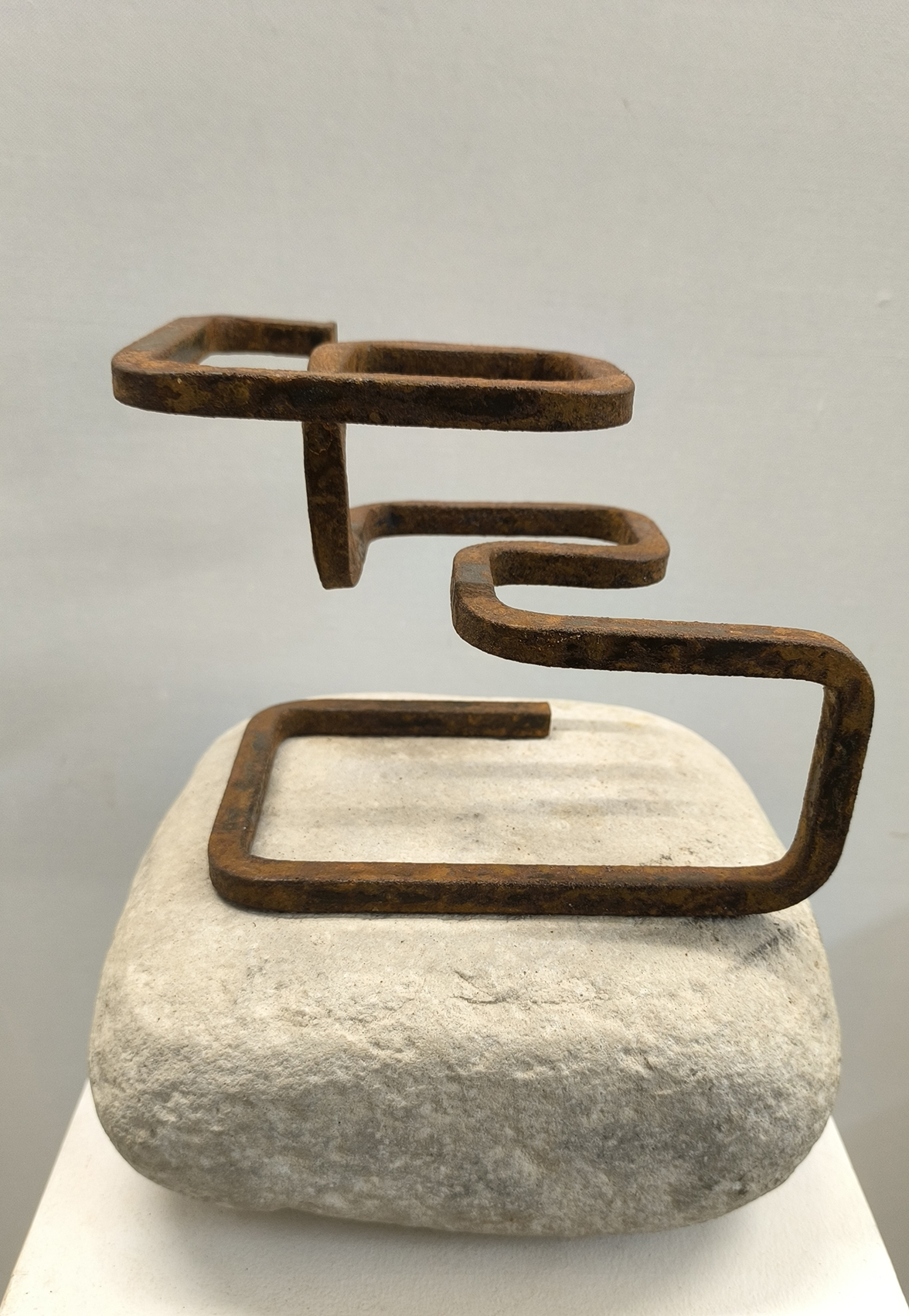 Pour sculpter, je descends à Tafalla (Navarre), dans le village de ma mère, et là, dans mon champ en plein air, quand le temps me le permet, je crée et réalise mes rêves et mes idées. Je me plie dans le froid, avec la seule force de l’énergie de mes bras et de mes pensées. Dans la pierre s’imprime le passage du temps…, la terre mère ; le fer, également d’origine minérale, exprime le mouvement, le mouvement humain…, le moment exact dans le passage du temps…, et c’est à travers ses courbures que j’exprime nos moments les plus amoureux…, rapides,…, tragiques ou répétitifs… tragique ou répétitif… et la vie continue… car l’acier poursuit son chemin… …. C’est alors que j’emmène les sculptures dans mon atelier de Bera de Bidasoa (Navarre), où je réalise les montages et les finitions.