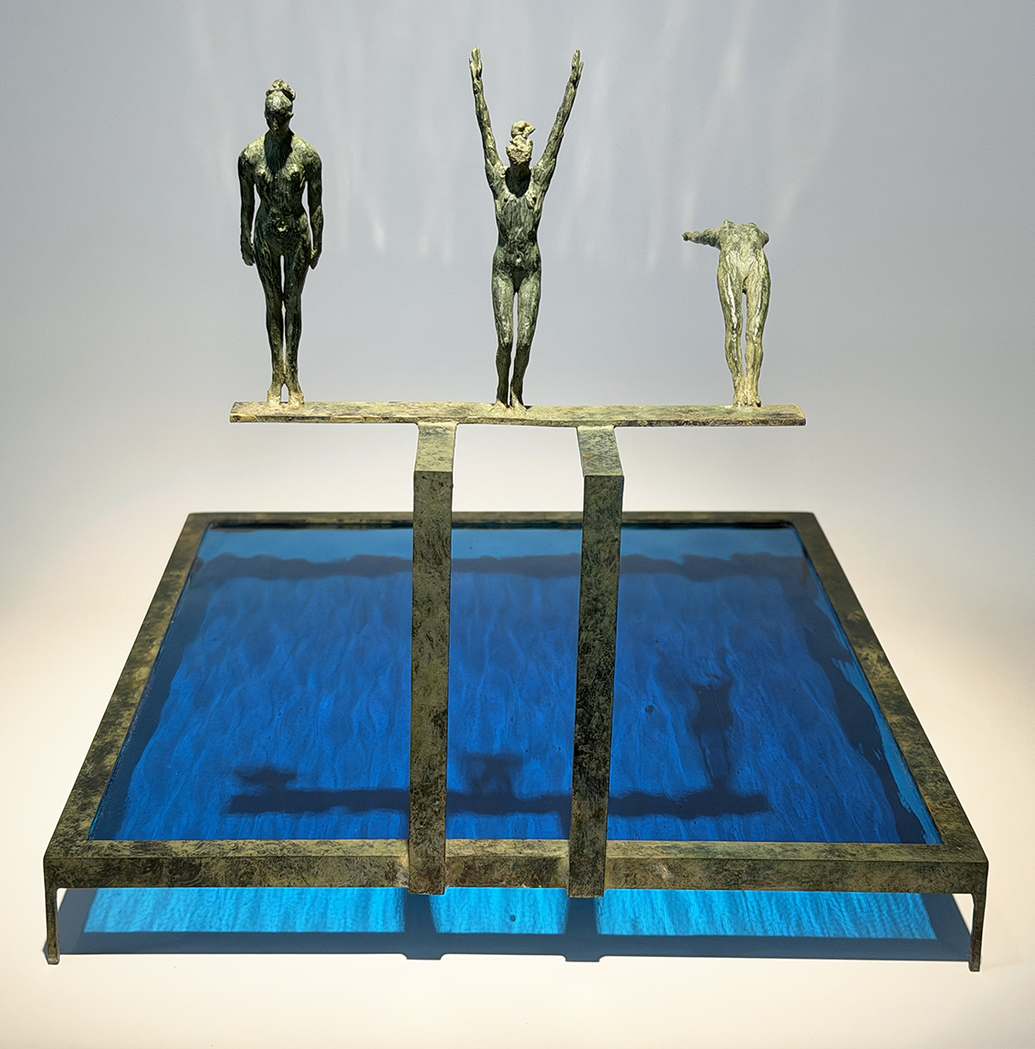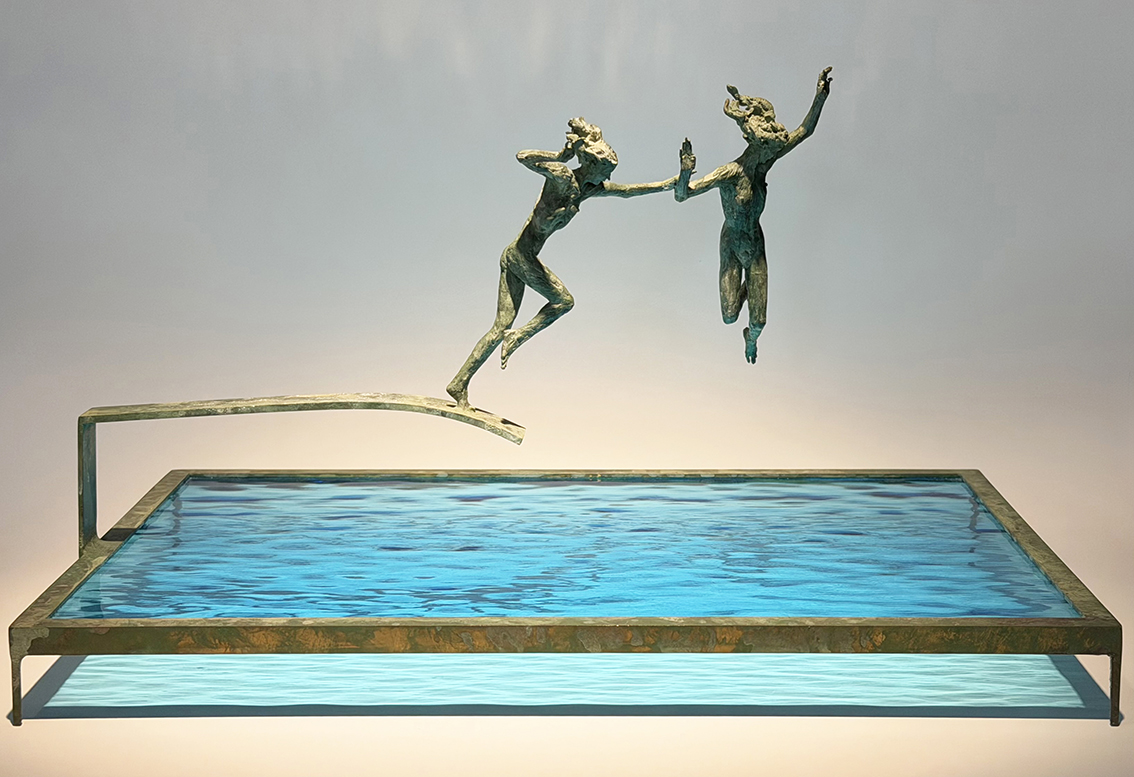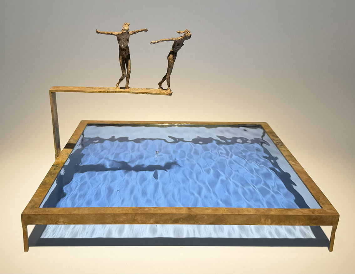 Un instantané cinématographique semble fixer les figures fines tendues par une vive force de mouvement, sauts éphémères immortalisés dans leur plus intense tension. L’on trouve ainsi des plongeurs prêts à se lancer dans des «fragments de mer», dans des morceaux d’eaux inconnues, profondes et enveloppantes,un peu menaçantes ; des surfeurs chevauchants des vagues gigantesques ; des personnages accrochés à des falaises escarpées.