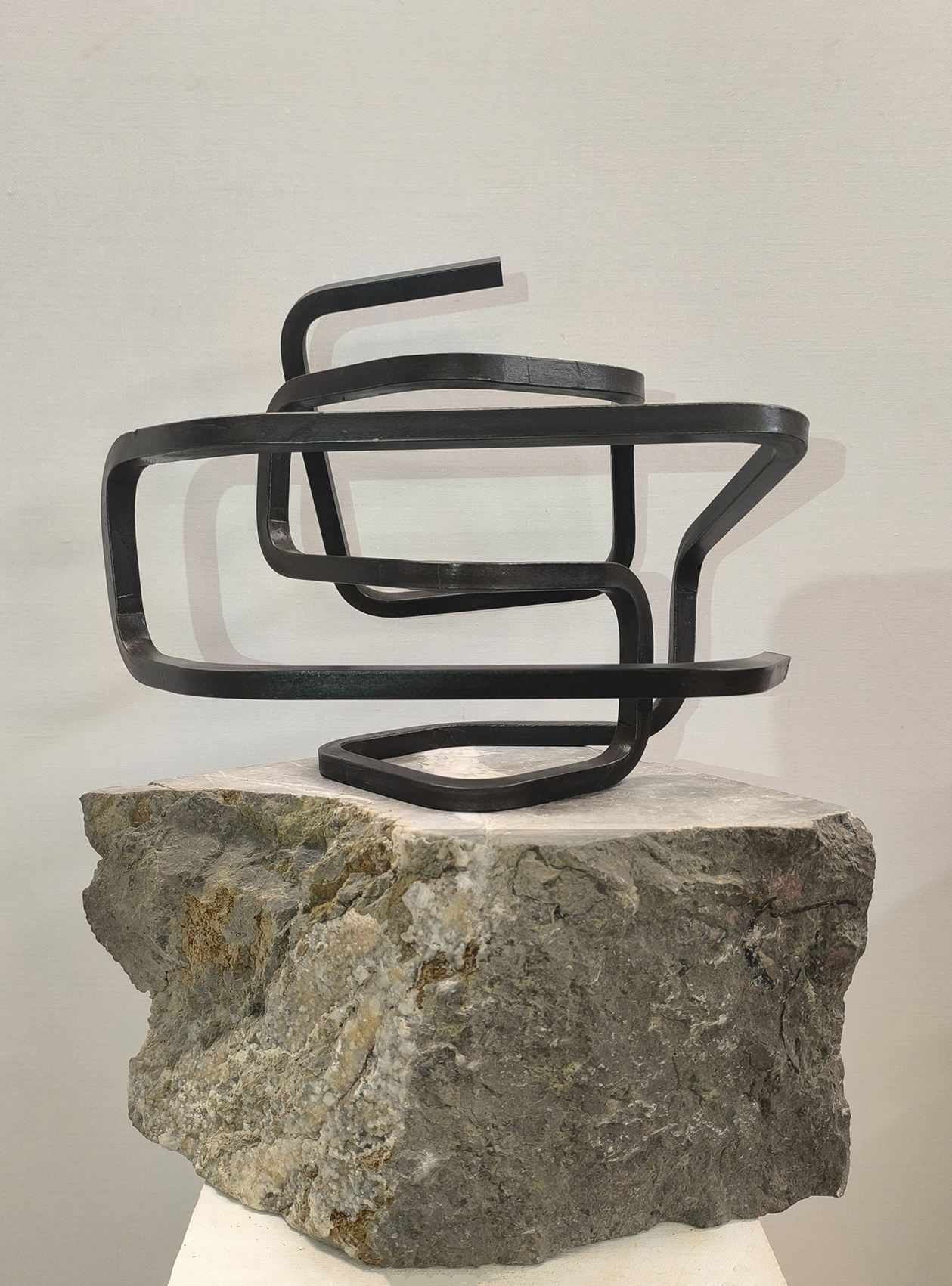 I bend my sculptures by hand and while the metal remains cold, a practice that allows me to feel the material and test my own physical limits. I work outdoors, in contact with nature, which inspires me and helps me achieve the union between steel and stone.