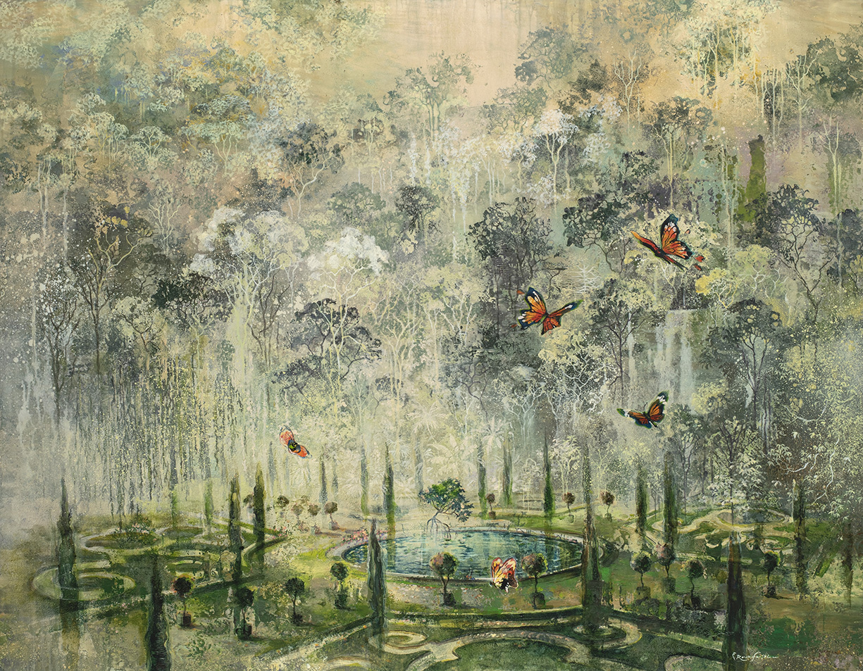 A timid panther drinks from a bottomless pool. Elsewhere, a pachyderm, king of long-lost lore, plods towards an unknown destination (Title of the work, date). In the blooming roses protecting the abyss of the jungle, the lush green foliage cauterises a gash of ultramarine blue which appears out of nowhere. Golden brown, enhanced with a fresh ochre accent, traces evanescent outlines. In other paintings, childhood flies away on the carousel of a life which flashes by like the seconds of an impossible eternity (Title of the work, date).